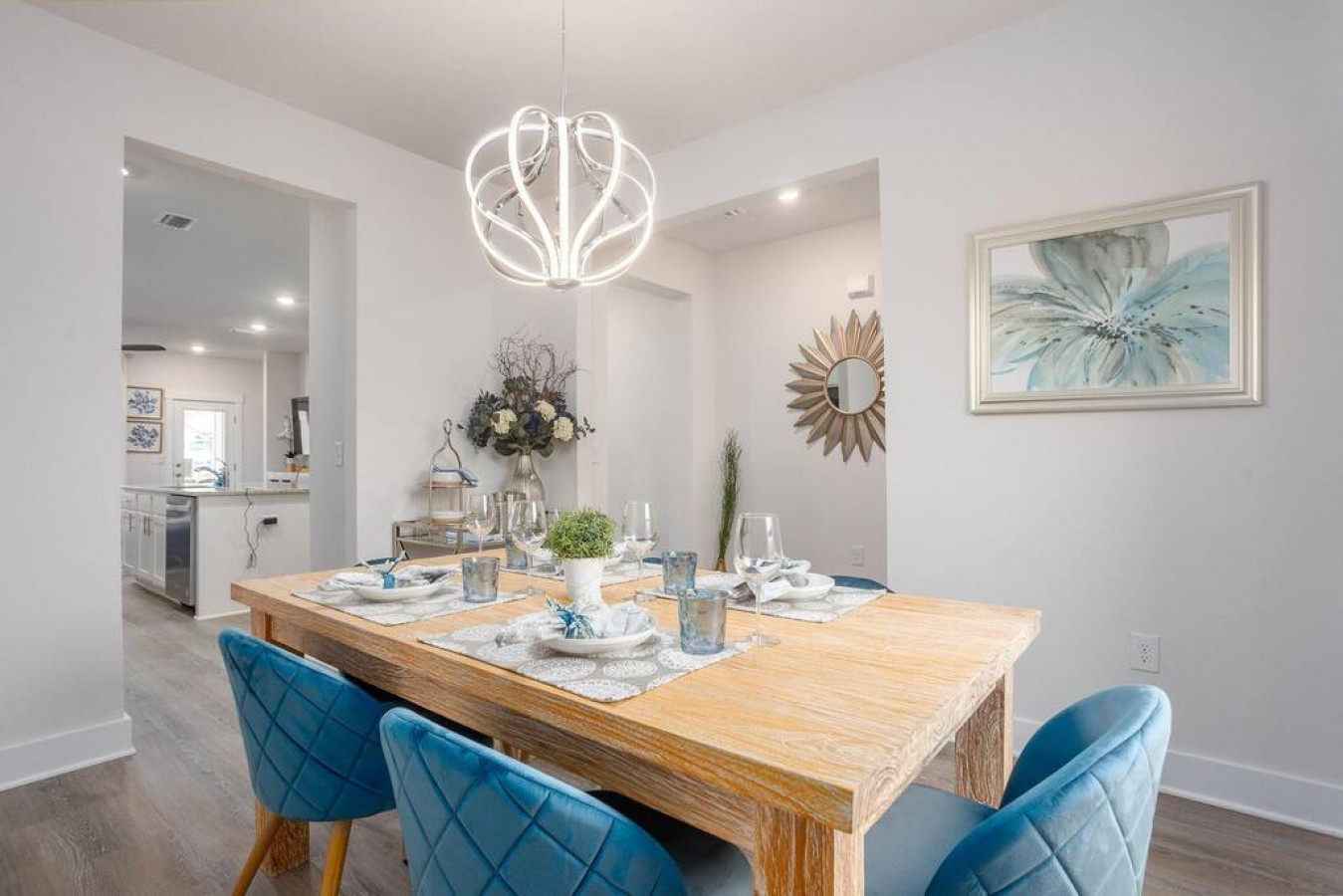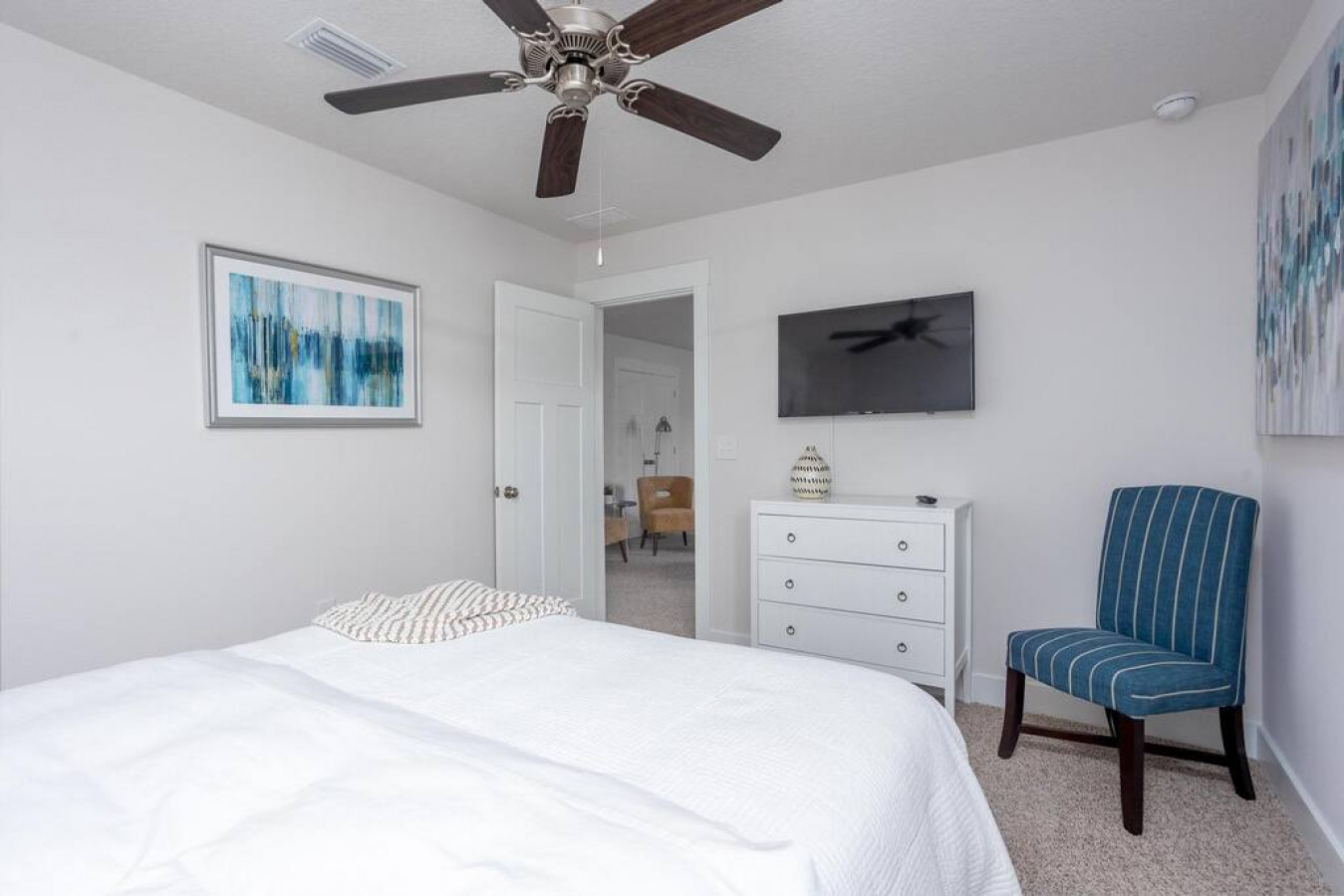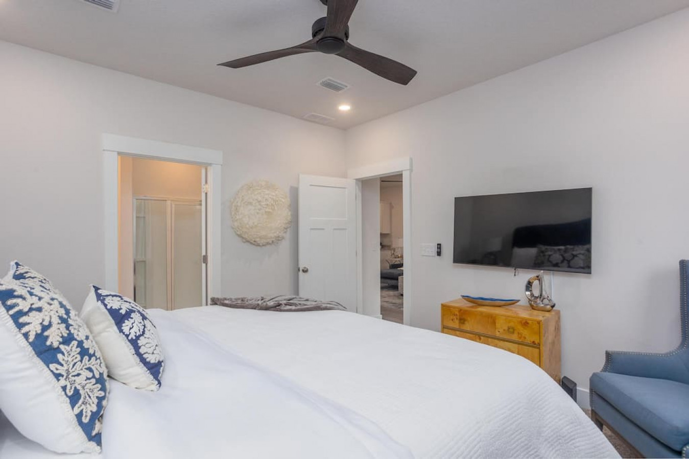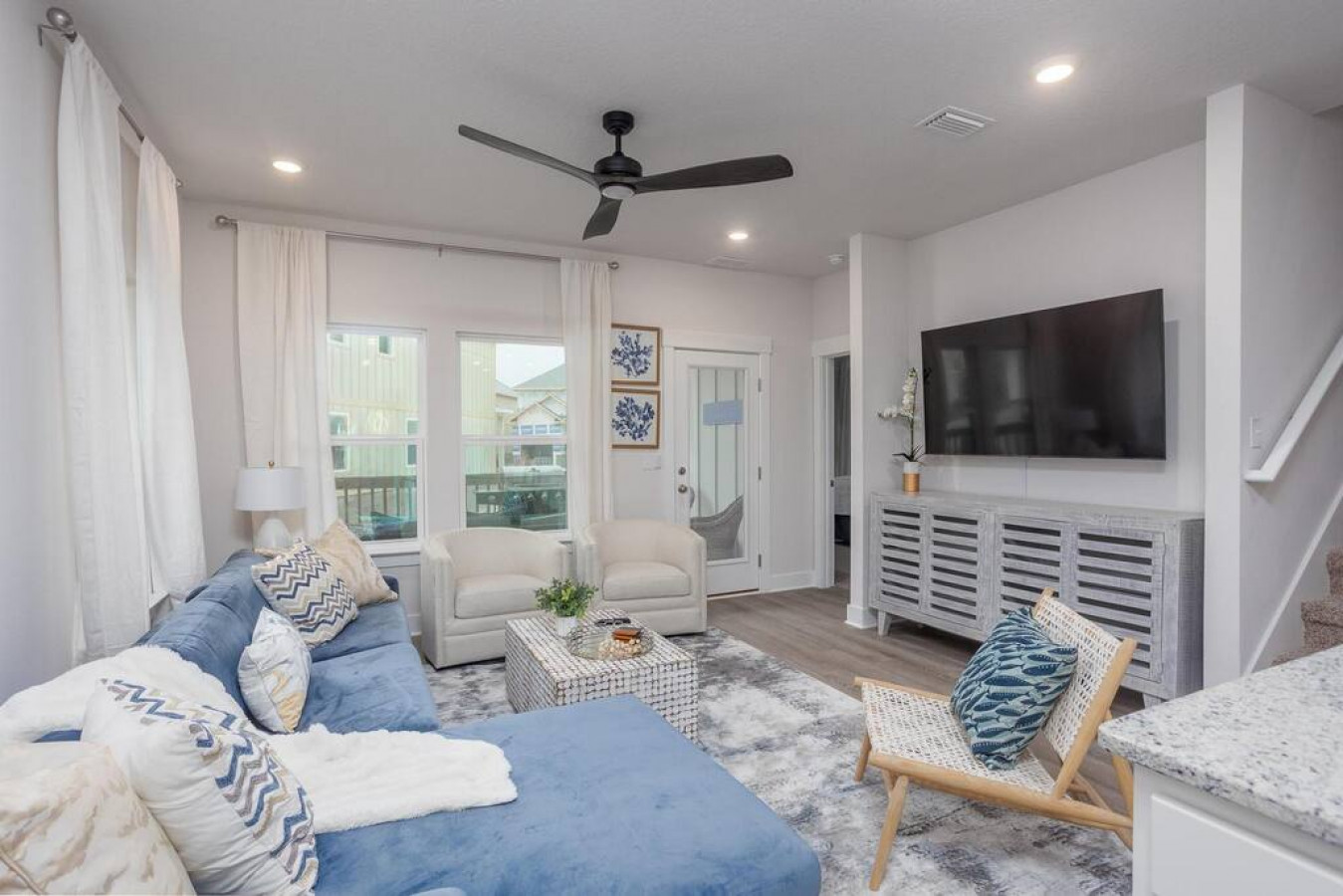 Upon entering the front door, guests will find an inviting and bright interior with splashes of color. Featuring an uncluttered, open floorplan and light color palette with neutral beach and organic tones with pops of rich blues.