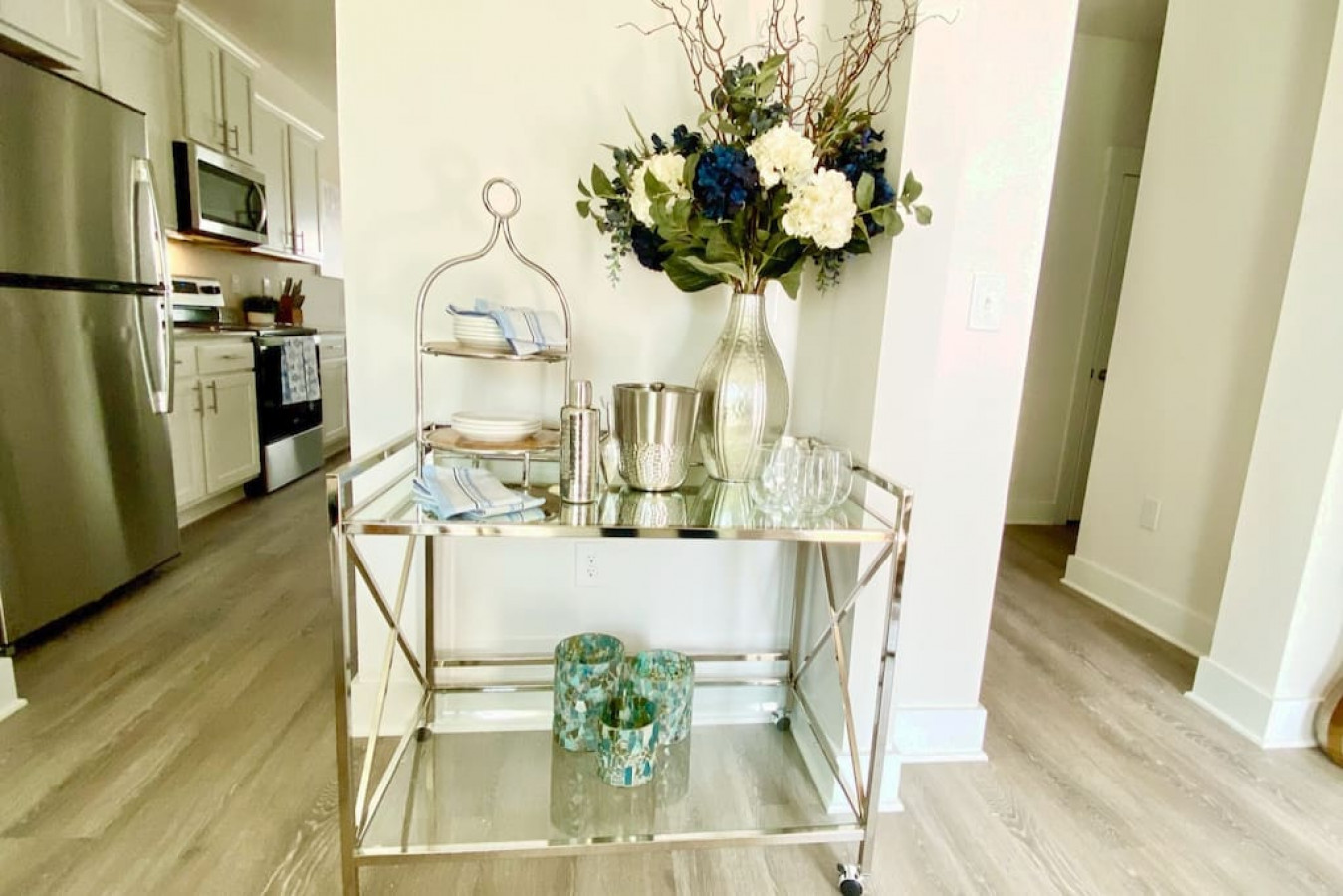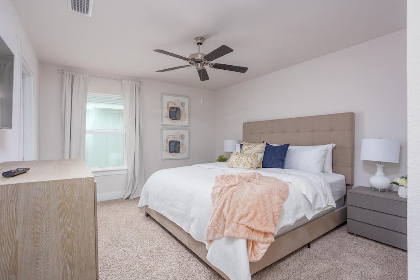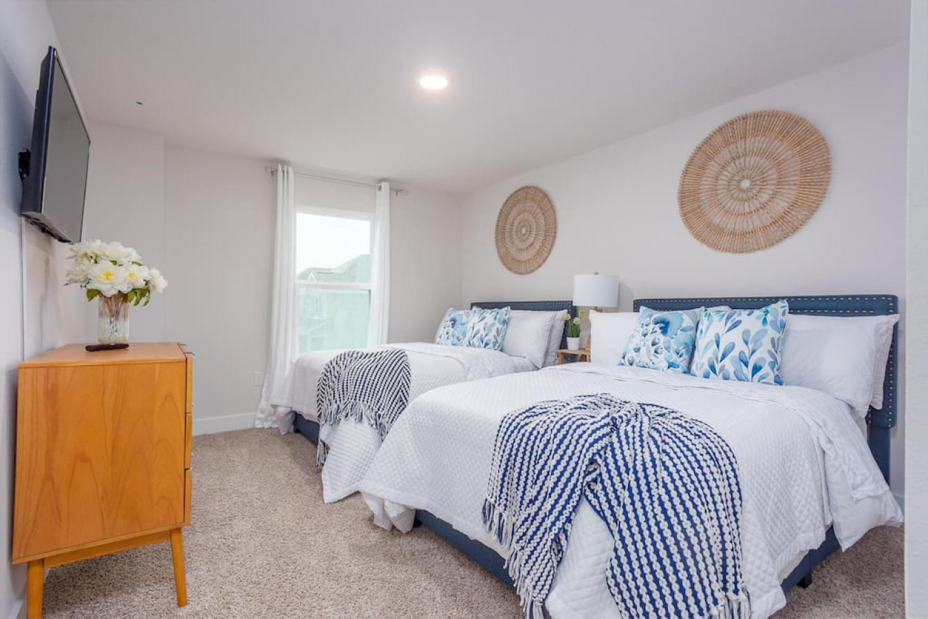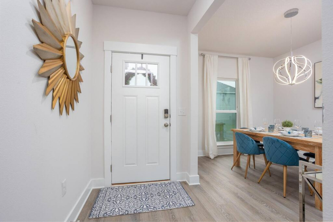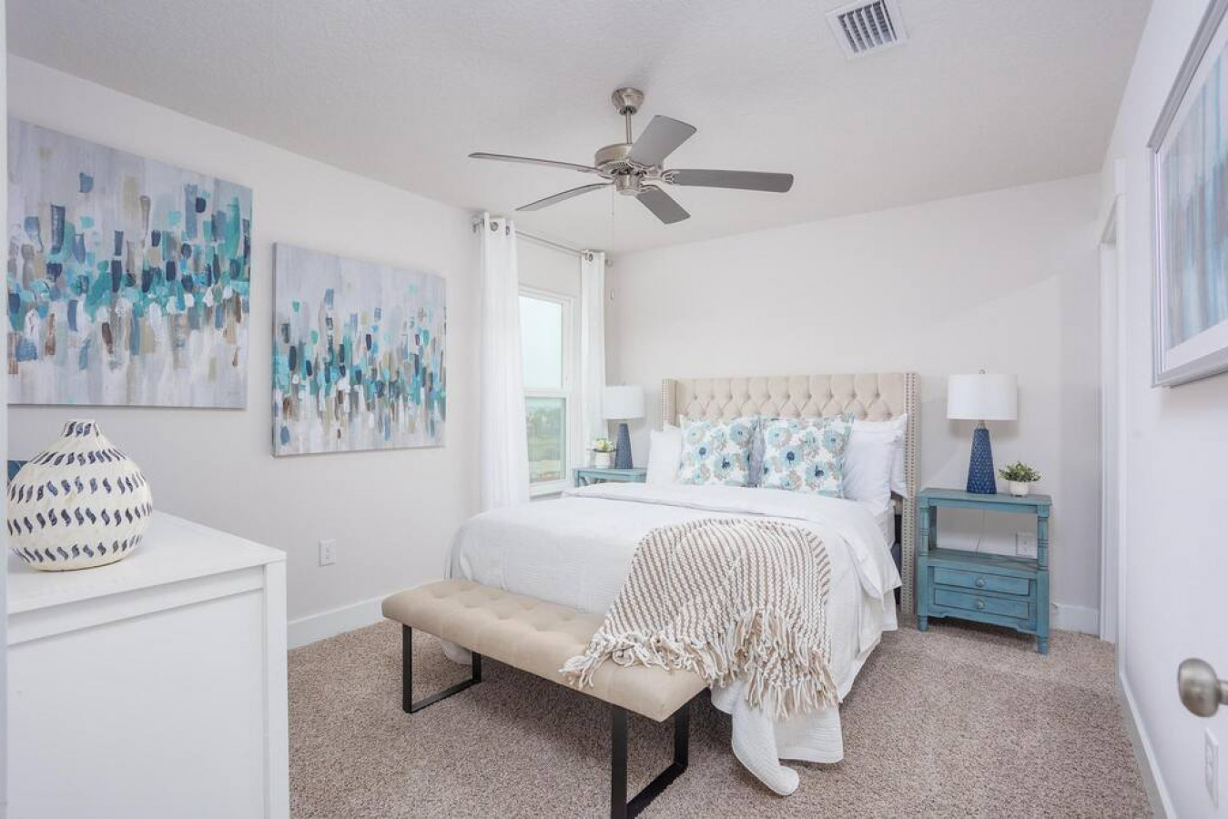 Upon entering the front door, guests will find an inviting and bright interior with splashes of color. Featuring an uncluttered, open floorplan and light color palette with neutral beach and organic tones with pops of rich blues.