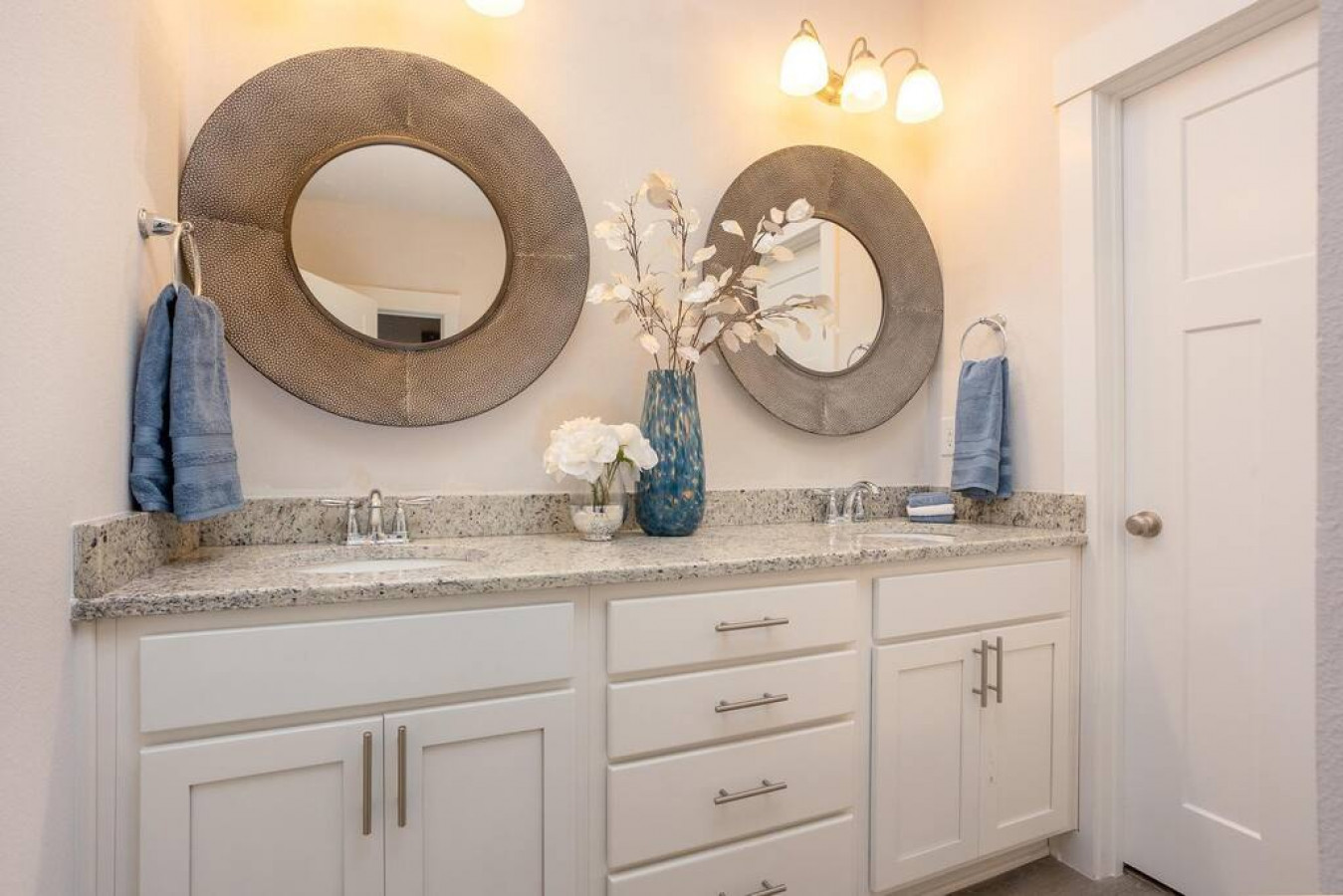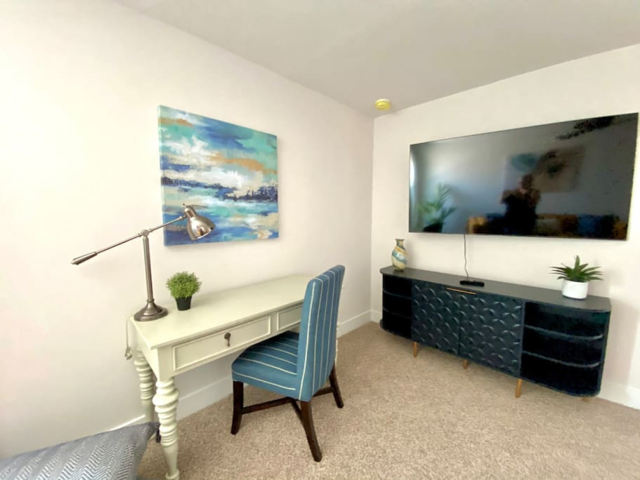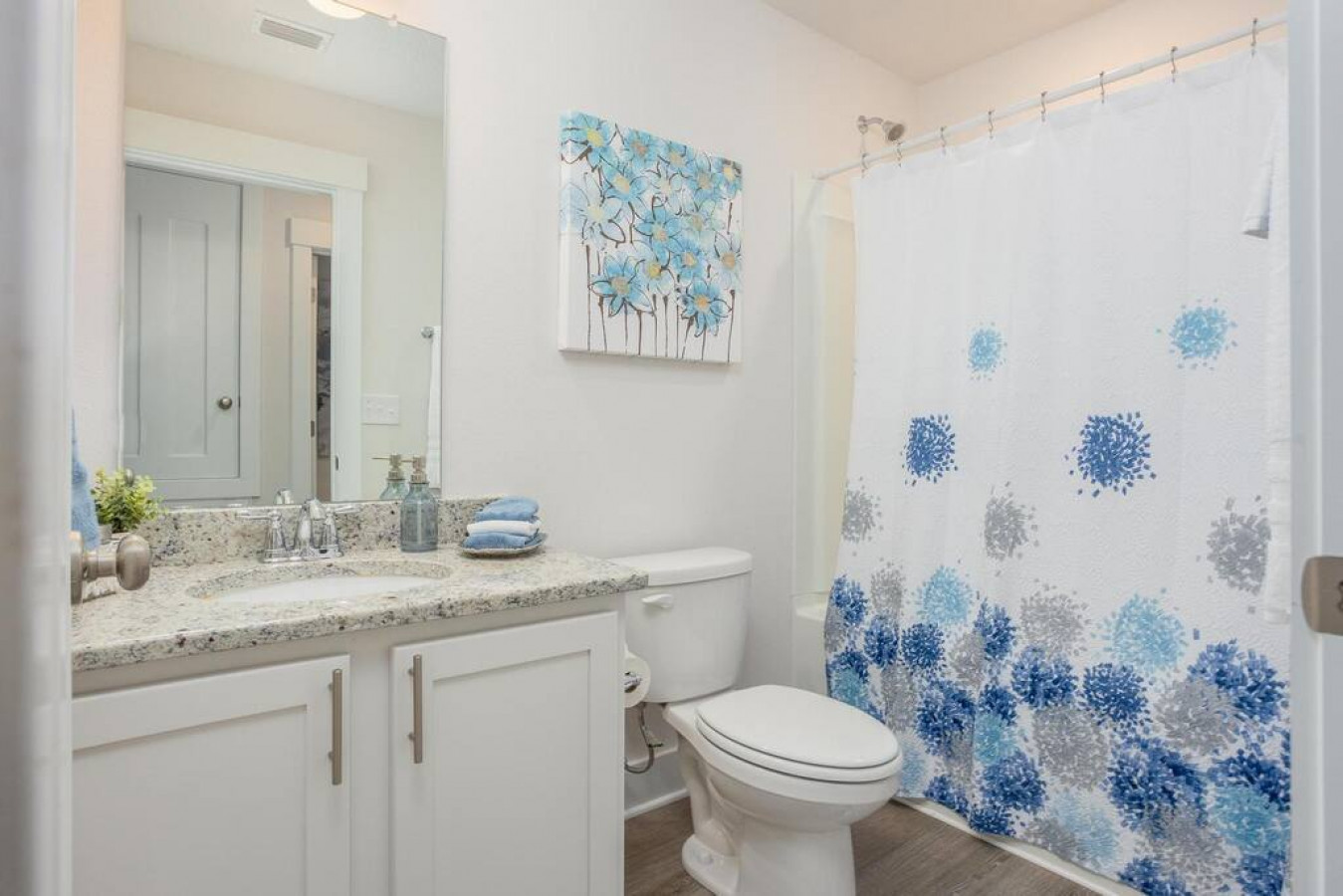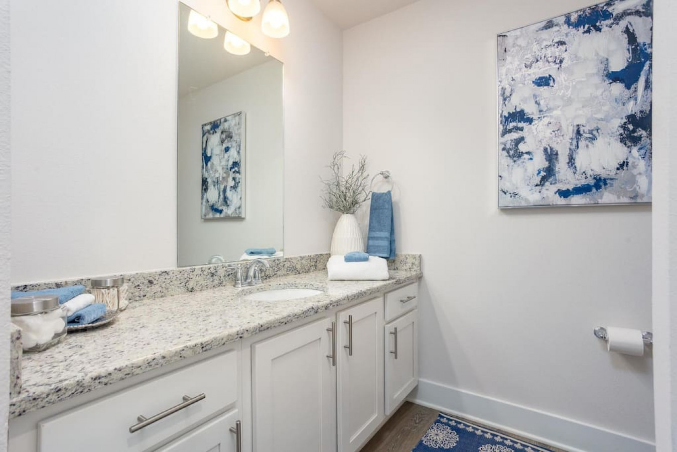 Upon entering the front door, guests will find an inviting and bright interior with splashes of color. Featuring an uncluttered, open floorplan and light color palette with neutral beach and organic tones with pops of rich blues.