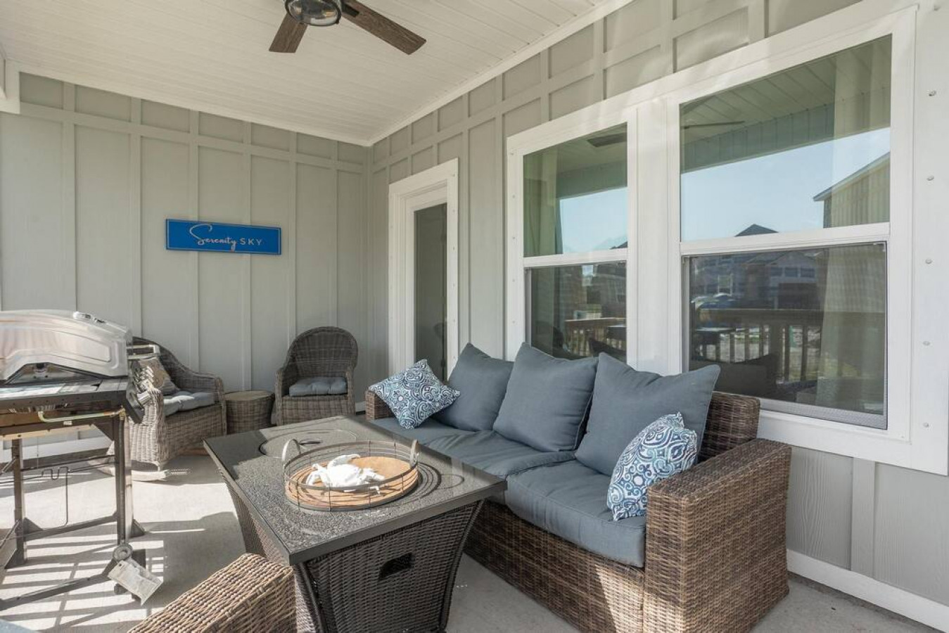 With a master bedroom on the main level with ensuite (attached bath), the main floor is primarily made up of living areas including: dining room, kitchen, living room, laundry room and half-bath. Relax on a full sofa plus two comfortable swivel chairs, and a leather strapped accent chair around the textured coastal coffee table. An exterior door leads from the spacious living room to the fully-furnished back patio which features oversized outdoor furnishings including a sofa, swivel chair, two rocking chairs and fire pit table, in addition to a BBQ grill - where better to catch the firey-sunsets of Perdido Key?
